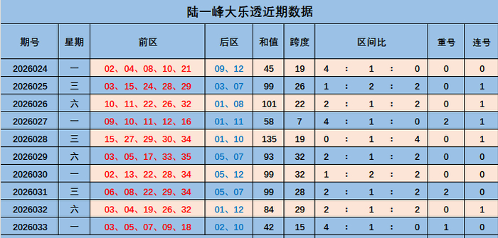 大乐透上期数据分析:前区03,05,07,09,18。后区02,10。前区和值42,跨度15,区间4:1:0,开出重号03。莫得开出连号。