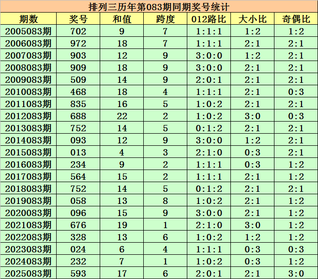 历史上第2026083期枚举三已开出21期奖号了,积年同时奖号分裂为:702、972、903、909、509、468、835、688、752、093、013、234、564、752、058、096、676、328、024、232、593,详确统计见下表: