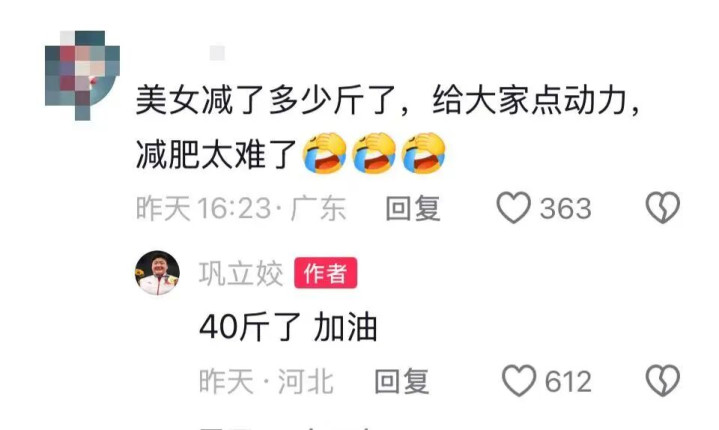 视频中巩立姣晒出两段视频,现在的她较之前瘦了不少,好多网友直呼认不出来,巩立姣在探讨区回答称:还是瘦了40斤,加油。