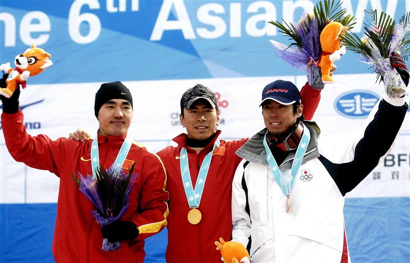 2007年亚冬会,夺冠的韩晓鹏(中)和摘银的邱森(左)一样来自沛县(新华社)