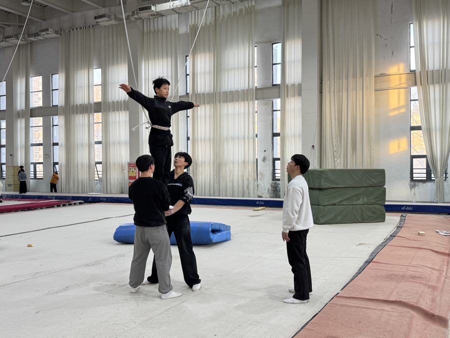 沛县体育中学体育馆内,学生们在扶植的指导下锻真金不怕火技巧动作(金亦辰 摄)