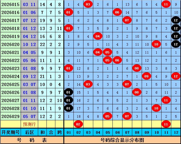 后区奖号分析:上期后区开出奖号05+07,奖号和值为12,跨度为2,本期后区精明和值走大,参考两码02 11。