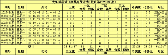 前区三区走势:上期前区奖号三区比为4:1:0,最近10期前区奖号三区比为22:11:17。