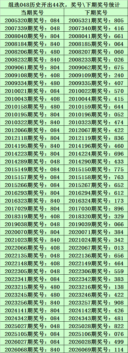二、组选048分析:摆设三历史上已开出44次组选号码048了,其奖号和下期开出奖号统计如下: