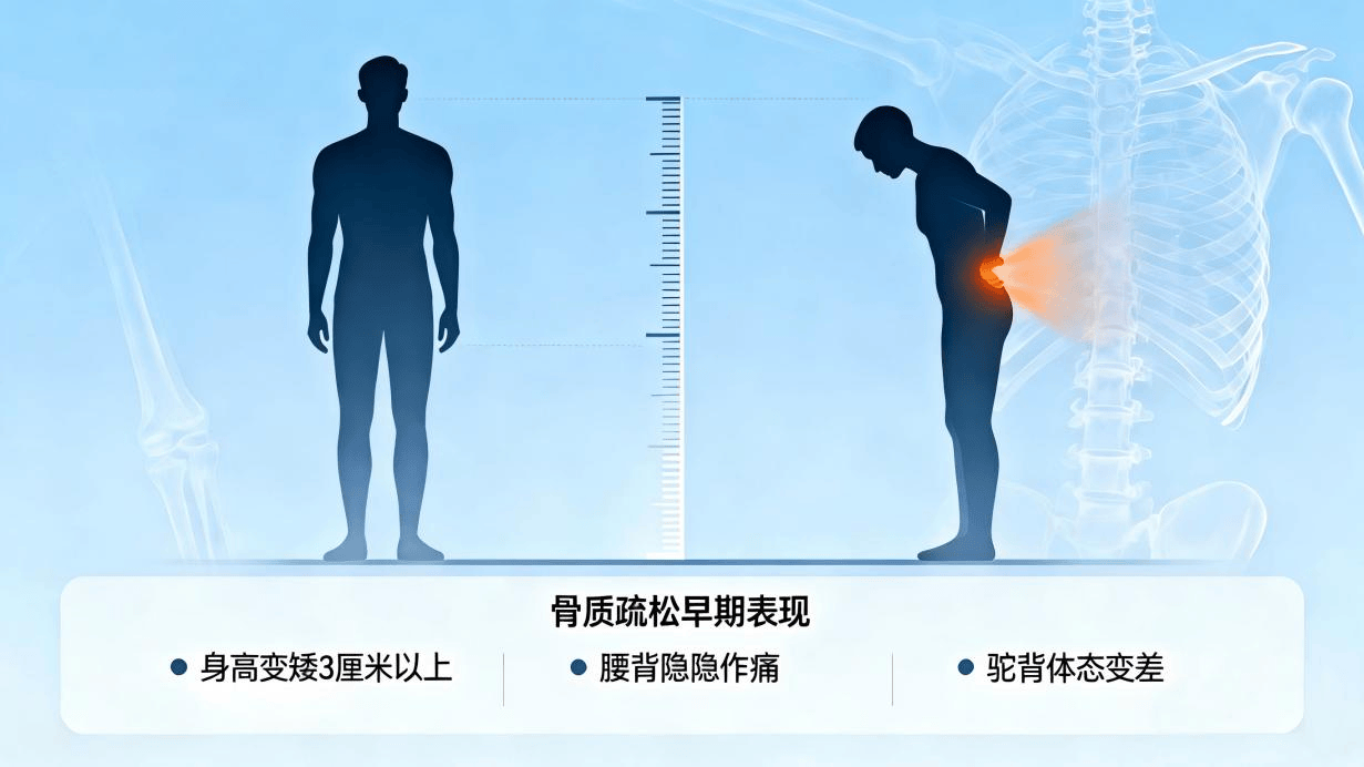 事实上,骨质疏松早期并非毫无征兆,仅仅那些信号太遮蔽,容易被咱们忽略:比如,身高频年青时矮了3厘米以上;经常认为腰背隐约作痛,说不出具体那处不酣畅;驼背越来越彰着,身形越来越差。这些看似不起眼的小变化,其实齐是骨量在偷偷流失的信号。