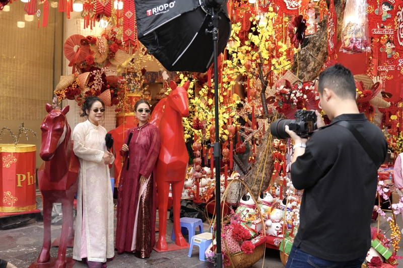 2月13日,在越南齐门河内的马市街,两名女子在马年新春掩饰前合影眷顾。春节将至,越南齐门河内年味全齐。新华社记者 刘颍 摄