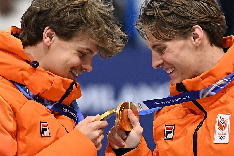 夺得须眉5000米用功冠军之后,荷兰队的范特沃特昆季在领奖台上庆祝收效