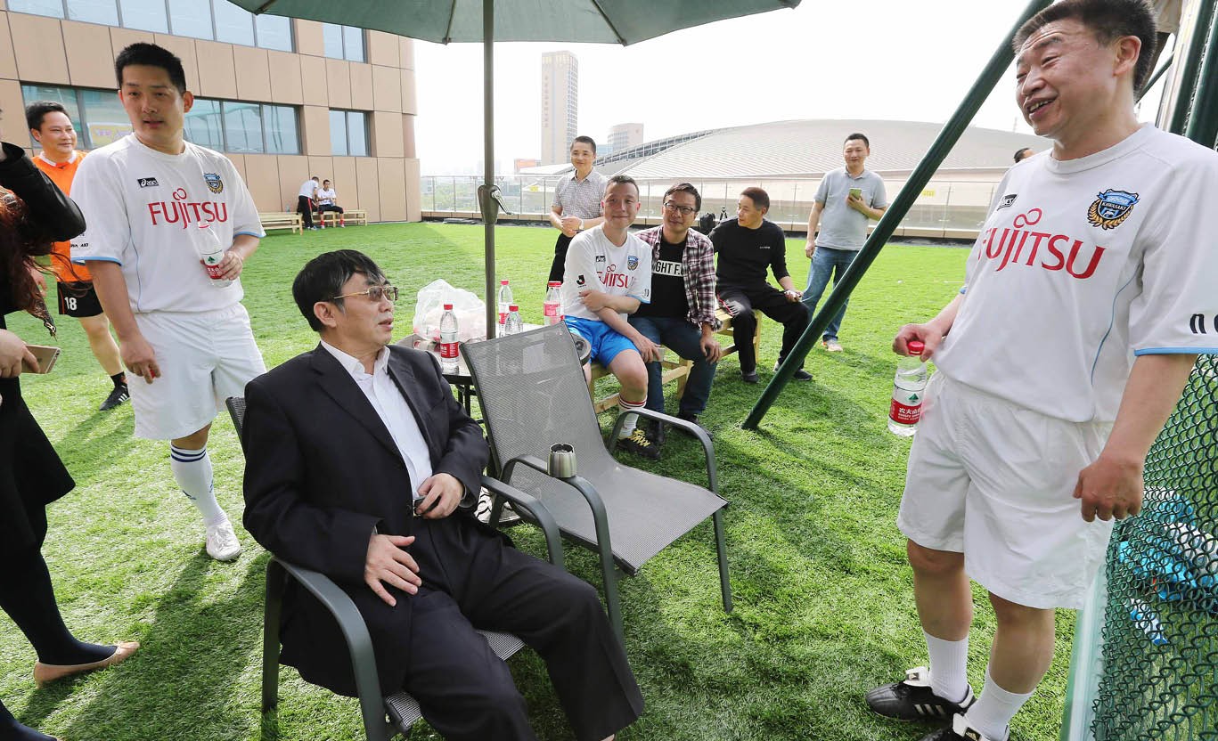 聂卫平在笼式足球场观看围棋弟子踢球,并在中场休息时指导常昊(左)、古力(右)等踢球。摄影/周国强