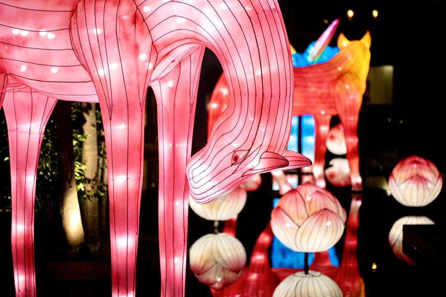 记者在现场看到,高达数米的“瑞马”灯组与其在水面的倒影,在建筑多样的体块、线条与材质间构成虚实交织的图景。
