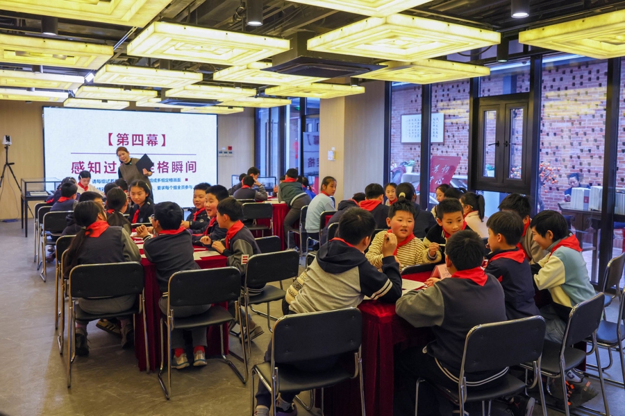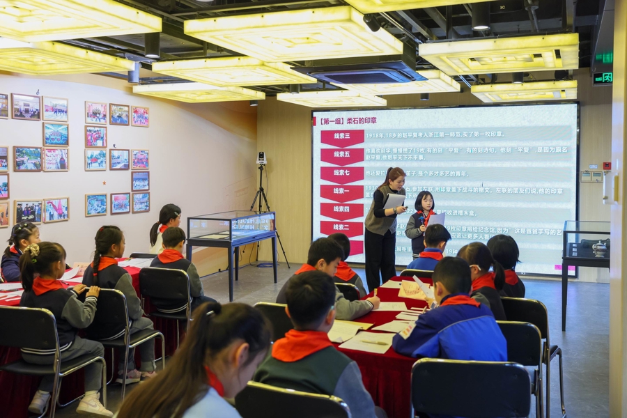 40余名小学生化身“文物代言东谈主”感知、了解、传播“左联五义士”的故事。 文通告记者 叶辰亮摄