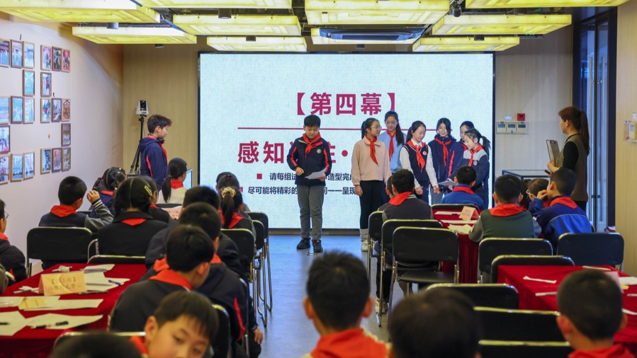 孩子们分组经营、集体扮演与“左联五义士”文物关联的历史片刻。 文通告记者 叶辰亮摄