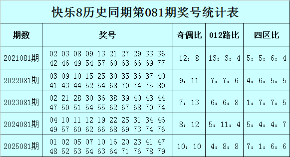 奇偶比分析:第081期历史同时奖号奇偶总比为46:54,偶数号码相对较热,旧年同时奖号奇偶比开出10:10,本年第081期瞻望奇数走热,温煦奇偶比11:9。