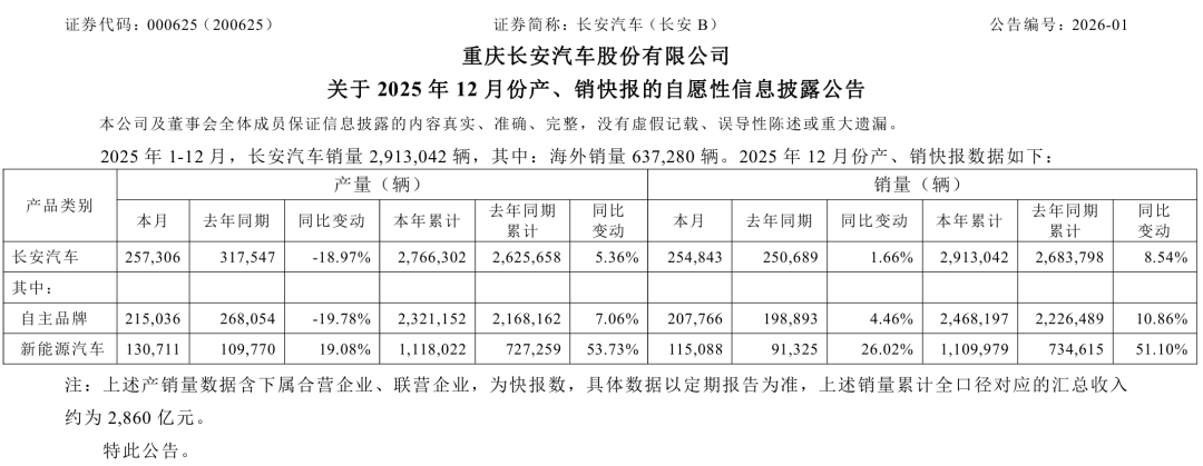 销量层面,2025年全年长安汽车全体施展较为肃穆,长安汽车全年累计销量为2913042辆,同比增长8.54%,全年销量创近9年新高。其中,自主品牌销量为2468197辆,同比增长10.86%;新动力汽车销量为1109979辆,同比增长51.10%;国外市集销量为637280辆,同比增长18.9%。