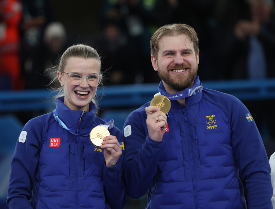 夺得本届冬奥会混双金牌的瑞典选手弗拉纳(右)容或在冰壶比赛中引进VAR(东方IC)