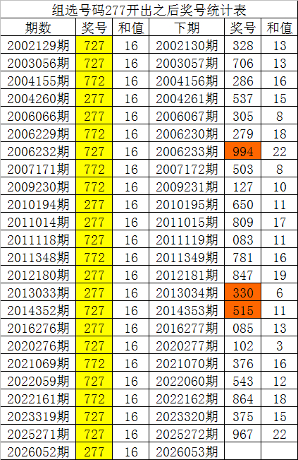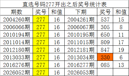 从以上统计不错看出,直选号码277出现之后,其下期奖号:1.下期奇数号码出现概率100%;2.下期小 号出现概率100%;