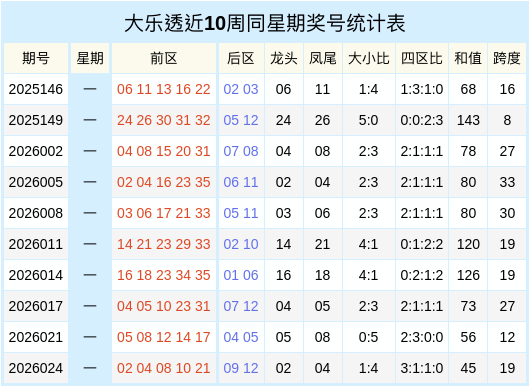 大乐透近十周同星期二奖号统计表