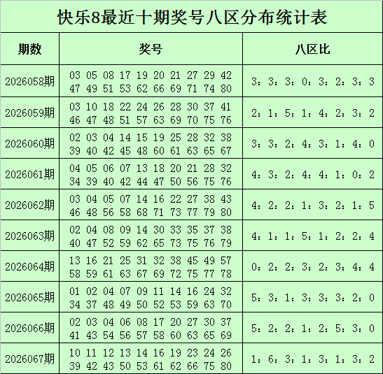福彩欢叫8第2026067期开奖记忆:10 11 12 13 14 16 19 23 24 26 39 42 43 50 53 61 62 66 75 80,其中奖号八区比为1:6:3:1:3:1:3:2。