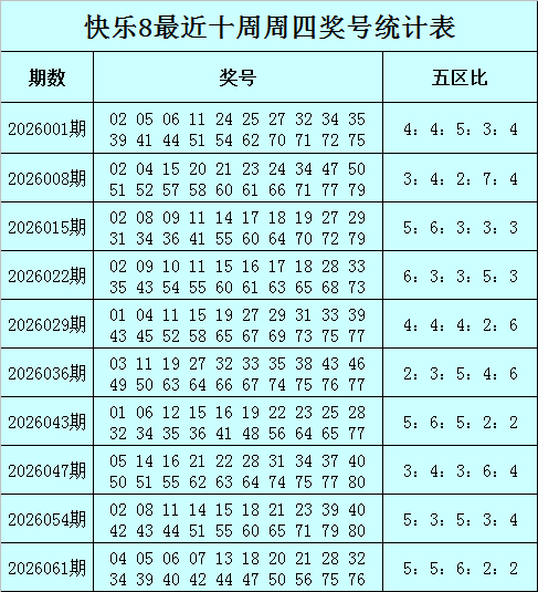 福彩景色8第2026067期开奖总结:10 11 12 13 14 16 19 23 24 26 39 42 43 50 53 61 62 66 75 80,其中奖号五区比为6:4:3:4:3。