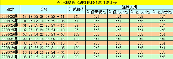 福彩双色球第2026032期红球和值概括分析: